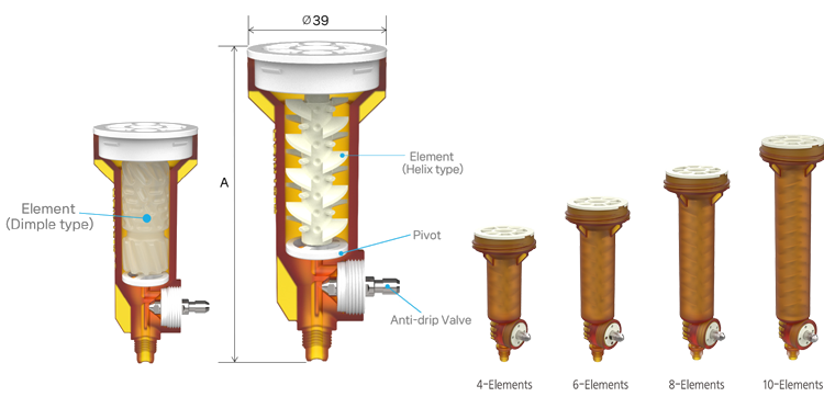 With a broad lineup by volume, element geometry, and element count, and an integrated mixer featuring ADV(Anti-drip valve), the system delivers excellent usability.