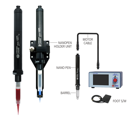 It is a pen-type dispenser that can precisely dispense minute amounts using a motor-driven method, without requiring air pressure.