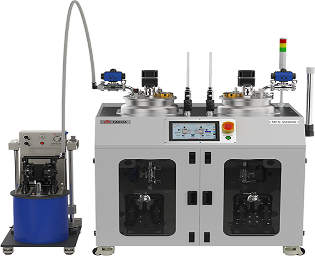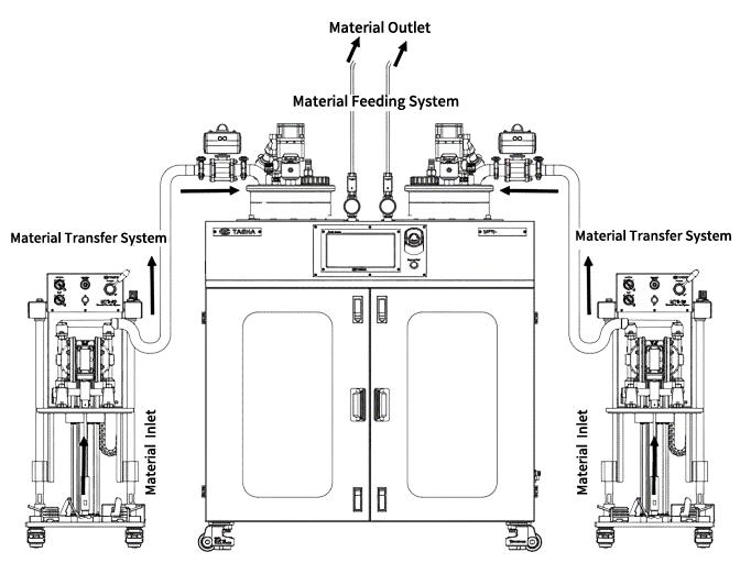 This system uses materials directly from their packaged containers (CANS), ensuring clean material transfer to the supply unit without contamination from foreign matter or air bubbles.