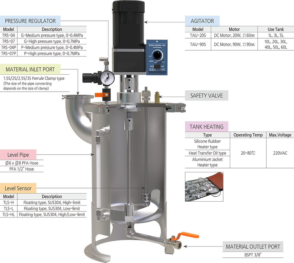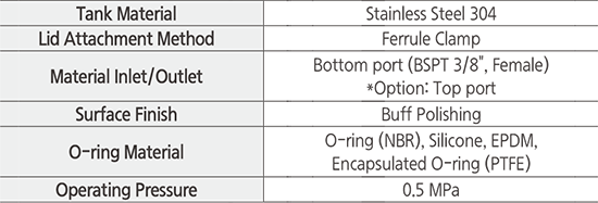 Taeha's Tank (SSR/SSF) series features standardized various optional specifications, such as electropolishing and Teflon coating, according to material characteristics and customer requirements, enabling flexible responses to diverse industries and processes. Furthermore, custom production with safety-certified types is available, considering workplace safety.